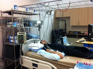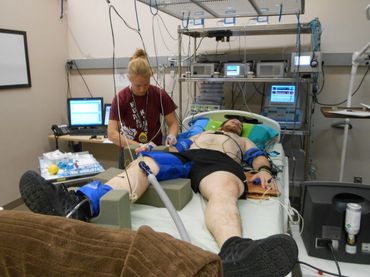 In addition to the various environmental chamber, there are two open space laboratories. The larger (20’ wide x 25’ long) space is equipped with a medical bed, exercise ergometers, physiological monitoring systems, whole-body heating/cooling systems (water perfusion suits with temperature controlled water baths), and other systems. This space is used primarily to conduct studies requiring invasive procedures performed under different thermal states during rest and/or exercise. This includes intradermal microdialysis (for the administration of pharmacological agents to assess the mechanisms governing the regulation of skin blood flow and sweating), measurement of muscle temperatures (multicouple temperature sensors are inserted into the muscle), hemodynamic assessments (includes the measurement of limb blood flow, cardiac output, other).