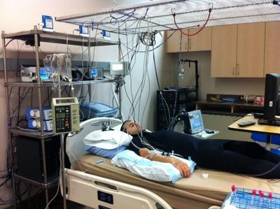 The second room is equipped with a small exercise testing facility equipped with a metabolic system, treadmill, semi-recumbent and upright cycle ergometers and medical bed as well as blood and urine analysis equipment. This research space is used primarily to conduct patient screening and/or prepare the participants for the experimental trials.